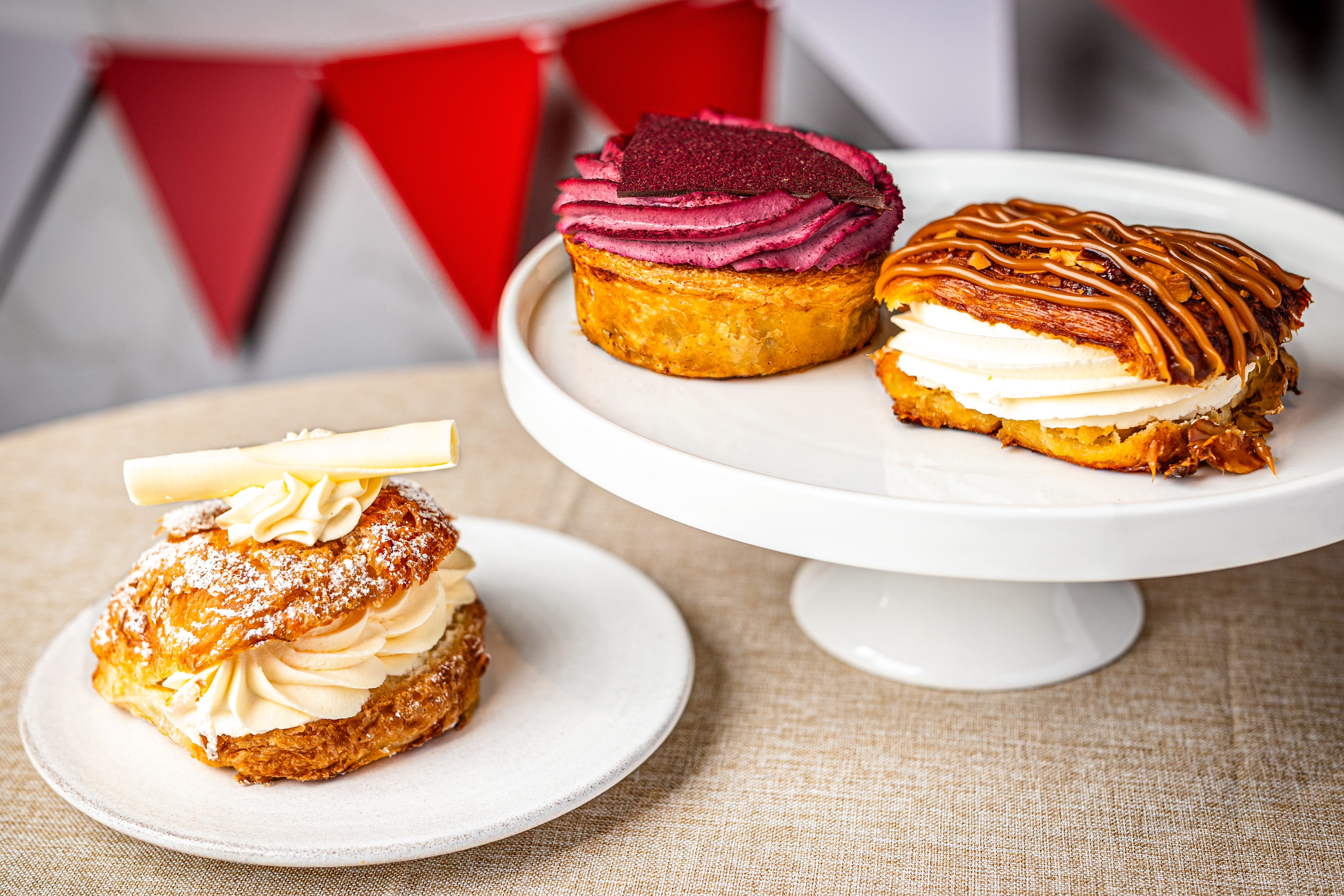 The Vanilla Festival Bun – filled with vanilla cream and whipped cream, finished with a swirl of whipped cream and white chocolate.